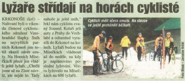 Akce Krkonoše aneb na kole až do nebes patří do kategorie Vyjížďka. Datum: 2008-04-26.