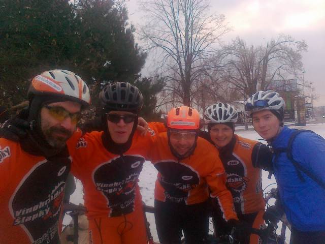 ). Pak už přichází SMS od Roškyho: "Na devatou u mostu bouraku" a už v tom zase lítám... Před barákem vyjeté koleje v ledu, jedu jak připodělanej, ale naštěstí hlavní tahy jsou obaleny jen jetelným slizem. Na místě srazu s Léňou jsem o trošku dříve a tak mu jedu naproti a cestou už potkávám 3 cyklisty, prostě před 9h. na Nový rok je na silnici více cykloidů než aut