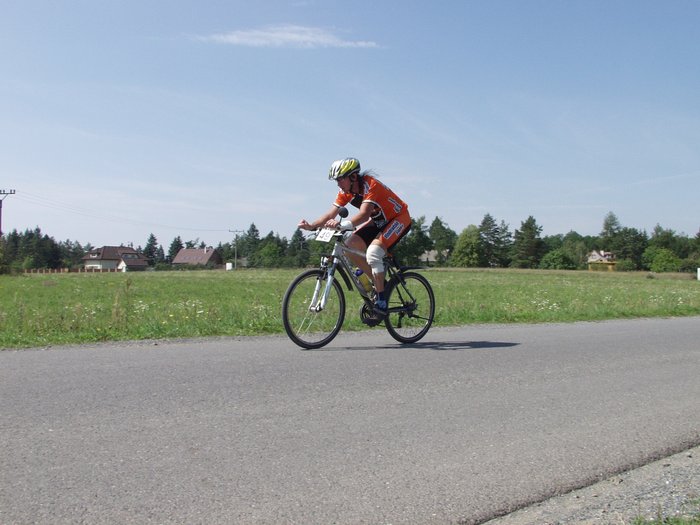 Půl minuty přede mnou odstartovala Dáša Likusová ze Silesia Orlová, v prvním kostkovaném kopci mi jela v cca půlminutovém startovním odstupu, na rovince s krásným asfaltem mi kousek poodjela a v kopci, kterému, my místňáci, říkáme Amerika, jsem na vršku sjela odstup na 15sec (to mi hlásil brácha, který nás tam přišel povzbudit). V hadovité skoro rovině jsem ji visela pořád stejně, ale poslední kopec mi odjela a ani v dlouhé rovině jsem neuspurtovala náskok a nakonec mi dala 7sekund, které mě pak dělily od 3. místa. Za cílovou čárou jsem měla mžitky před očima, úplně tuhé nohy se mi klepaly jak drahému psu a komunikovat s Robinem a Alánkem, kteří stáli u cíle, jsem začala až po pár minutách. Vlk dosáhl času jen o necelých pět sekund horším než já, což považuji za hrdinský výkon i vzhledem k tomu, že jeho kolo není silniční speciál a v sobotu natočil s Míšou neuvěřitelné množství kilometrů.