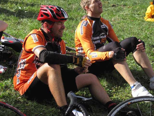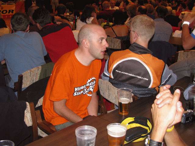 Louka před jídelnou se pomalu zaplňuje oranžovými dresy a sdělování si zážitků nebere konce, každý kdo dnes zdolal v tom nevlídném počasí svoji trasu, tak si zaslouží absolutorium. Večer v Družbě, kde máme díky našemu klatovskému ambasadarovi Frištenskému zamluvený stůl se ani moc slovy popsat nedá. To se muselo zažít, stejně tak následná tiskovka v baru. Stálo to za to!