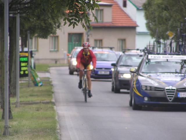 Chvíli se mi zdá tempo docela snesitelné a při dobrém zašívání v balíku a šetření sil vidím možný úspěch objet většinou část kilometráže. To, že je vše špatně je jasný už před Unhoští, někde to tam lehlo. Balík se rozdělil, začala kaše. Když jsme to v Unhošti dojeli, tak na náměstí, na tom vydlážděném úseku lehla nějaká cizina. Rozseklo se to znovu. Zůstal jsem na čele lajny, co honila chvost té lajny, před námi. Když jsem po minutě totálního úsilí konec dojel. Někdo zrychlil, vše se natáhlo znovu. Střídám. Všichni lámou 60ku, všichni leží nad horní rámovkou. Moje hobby tempo, nad 50km/h je mi v tu chvíli platné, jako slepému erotický časopis. Snažím se zachytit nějaký hák. Ale všechny pokusy jsou nadmarnost. Rychlost jakou pro mě končí Cyklovary a tím vlastně i závodní sezóna je ohromující. Musím uznat, ač v totálním komatu, že na tenhle balík musí člověk sakra dobře trénovat a bez sebelepší formy nemá smysl sem lézt. Dalších 15minut jedu vedle kolony doprovodných vozidel asi stejně rychle jako balík. Bohužel se ztrátou 100metrů. Srovnávám vše v hlavě, ve které to vše asi je. A za nedlouho slézám z umrlčího prkna a mávám na sběrný vůz.